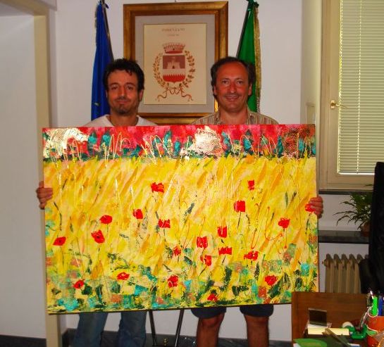 -ALFONSO CON IL SINDACO ALESSANDRO GHISONI E IL QUADRO DONATO AL COMUNE-